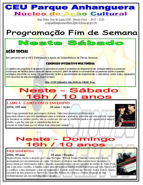 Neste sábado, das 8h30 às 16h30, temos o Caminhão Interativo da AES Eletropaulo, onde as crianças poderão interagir com os personagens da história. Às 16h, sessão de cinema com o filme "Lado a lado com o assassino".